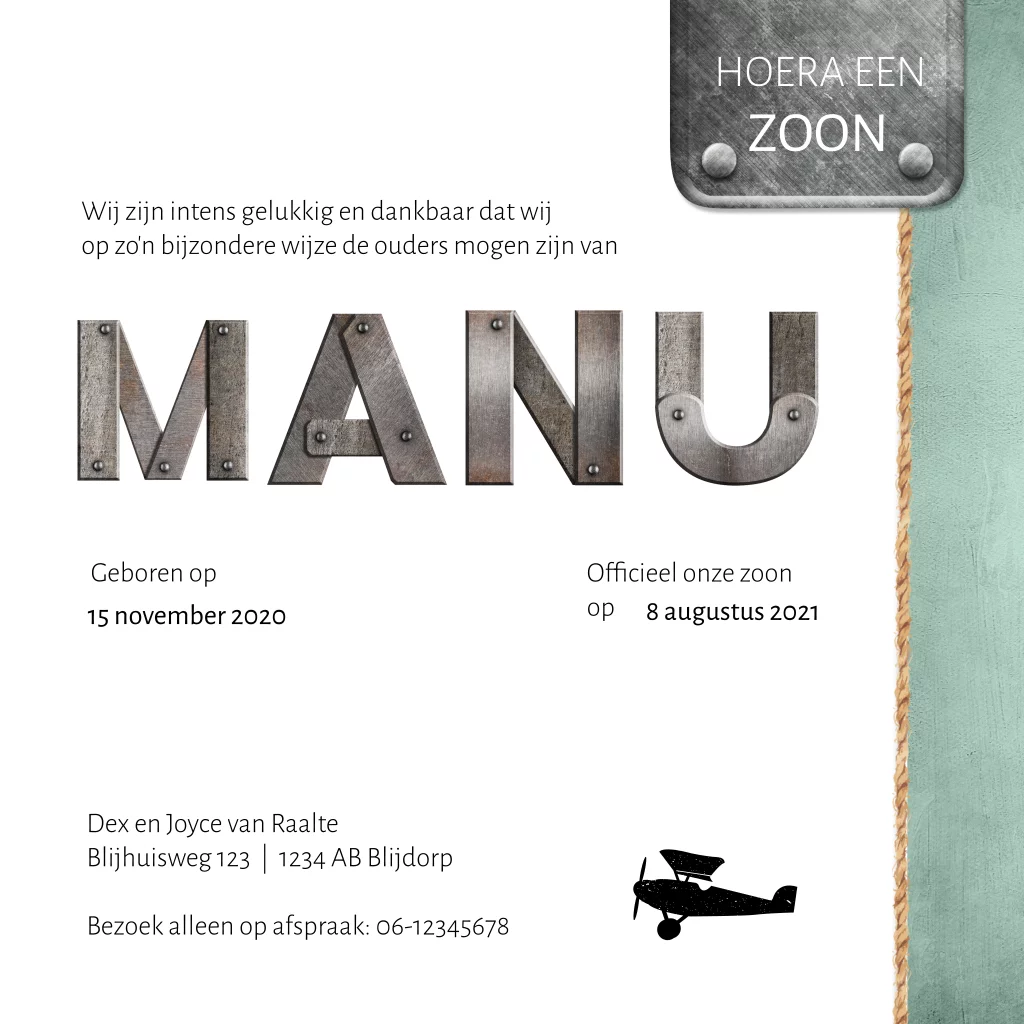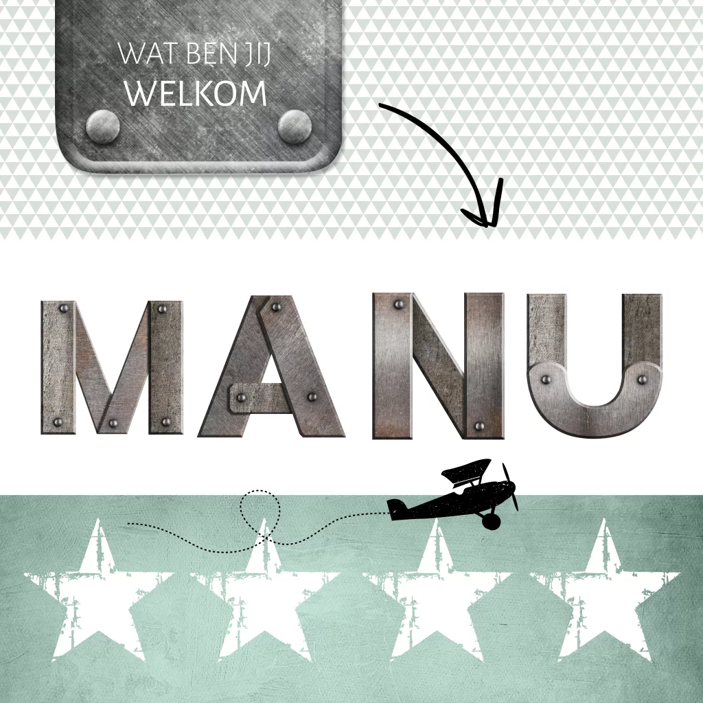Stoer adoptiekaartje voor een jongen met metalen letters. De letters zijn aan te passen in de editor of we helpen je er graag bij. Het metaal op dit jongenskaartje Manu is een mooie combinatie met de labels, de sterren en de groene kleur.