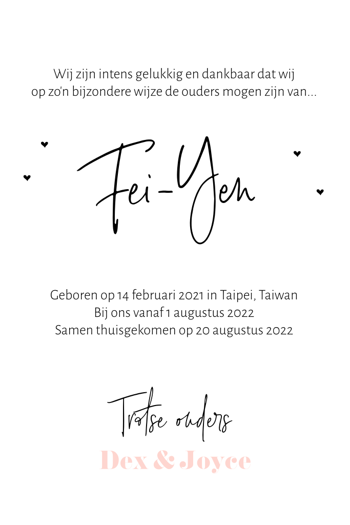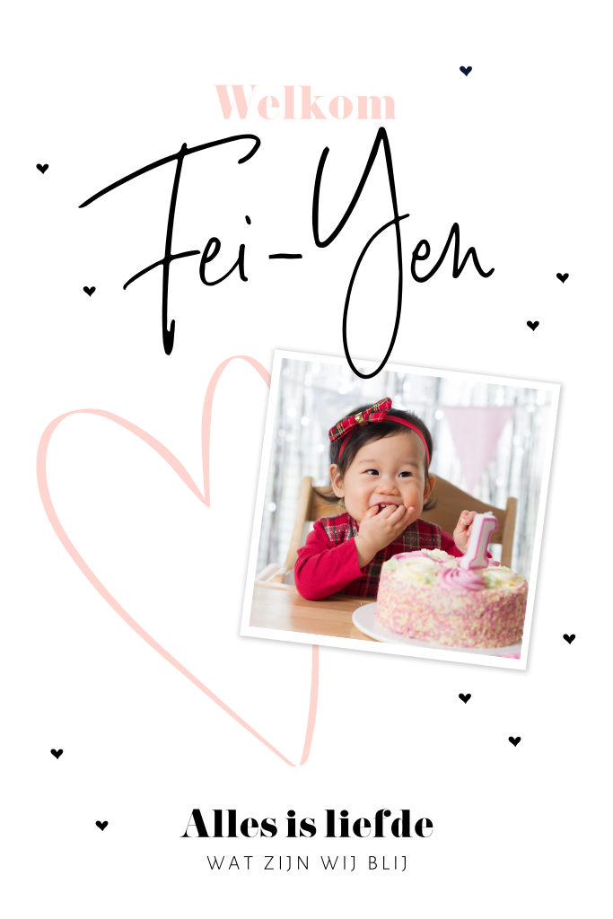 Op dit kaartje Fei-Yen plaats je een eigen foto van jullie kindje. Door het sierlijke lettertype springt de naam op dit kaartje er helemaal uit. Achter het fotokader staat een roze hart en kleine zwarte hartjes maken de kaart compleet. De kleuren en teksten zijn gemakkelijk aan te passen.