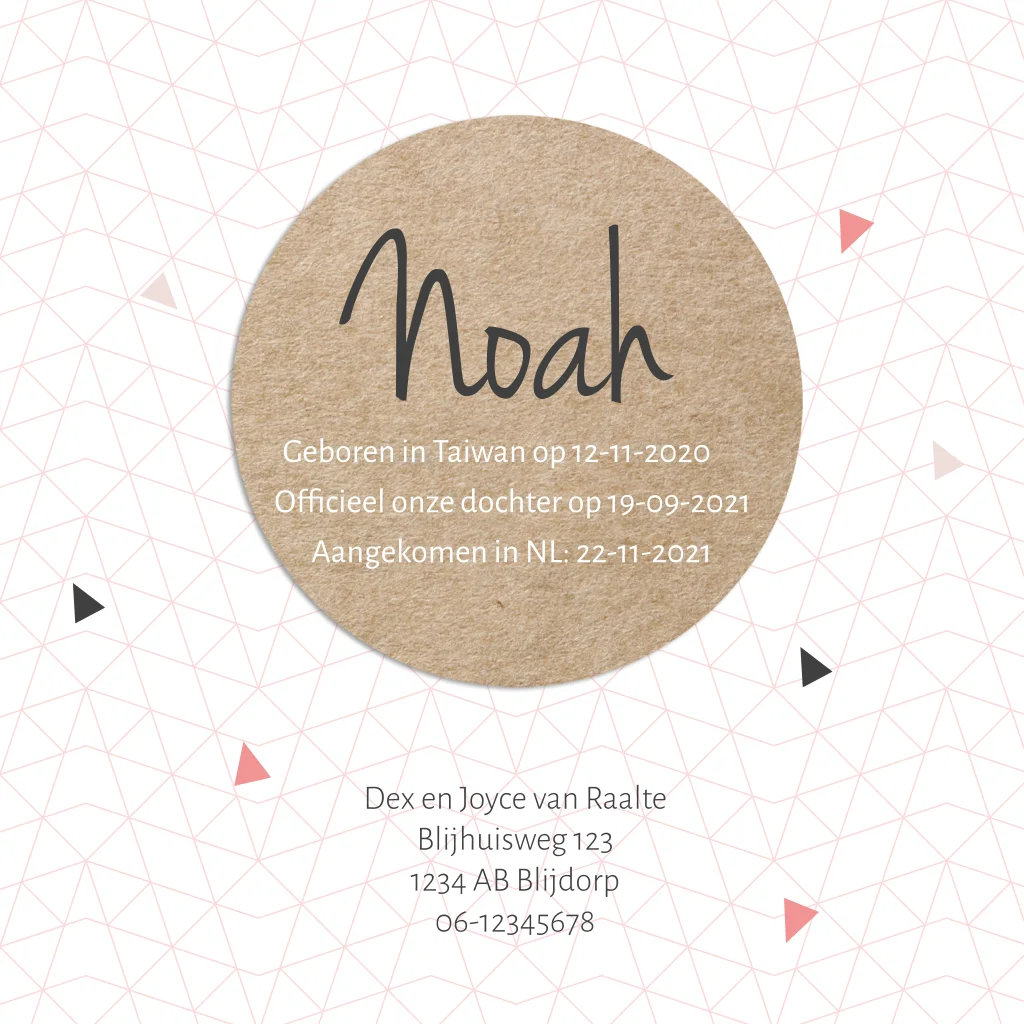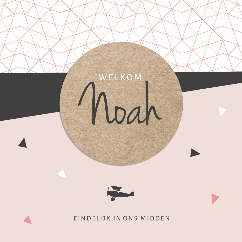 Geometrisch adoptiekaartje voor een meisje. In het midden staat een kartonnen cirkel met de naam van jullie kindje. Dit hippe kaartje Noah heeft geometrische lijnen, driehoekjes en een vliegtuig. De teksten en kleuren zijn gemakkelijk aan te passen.