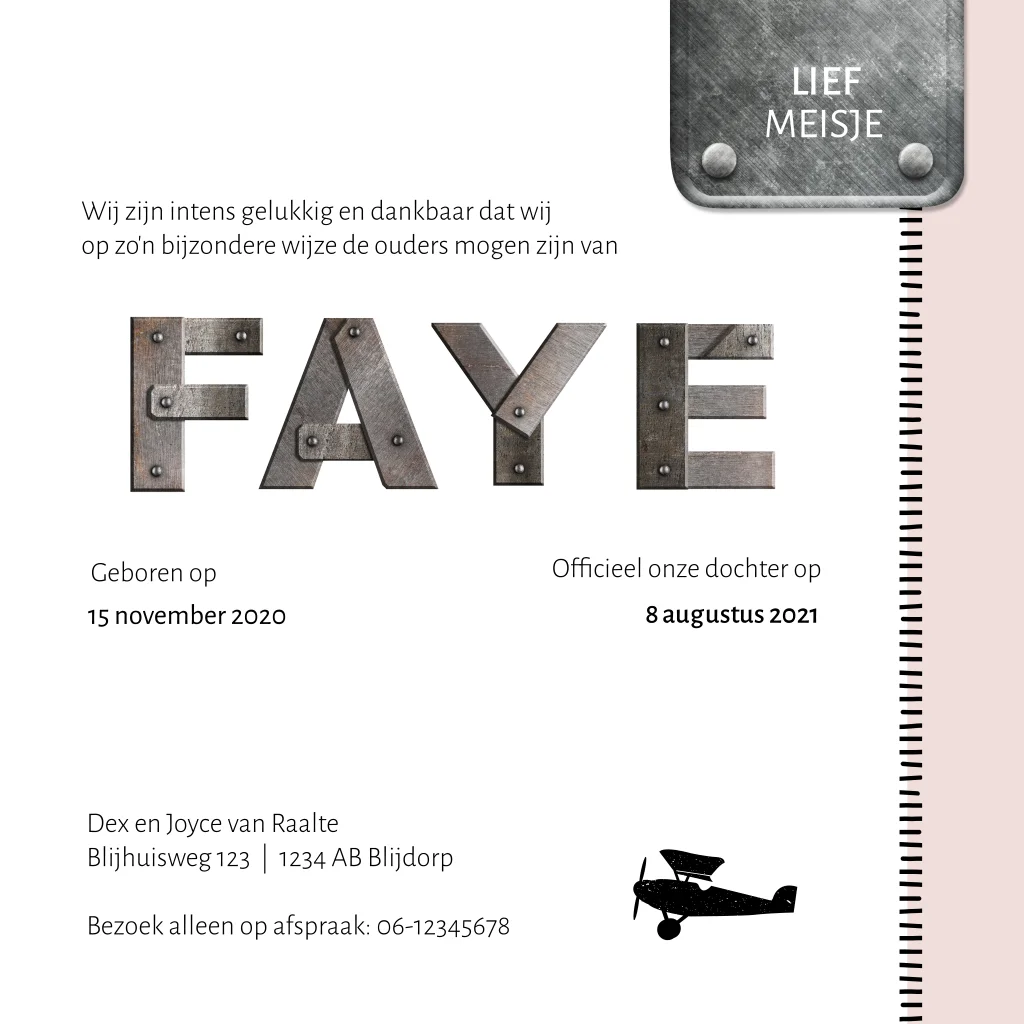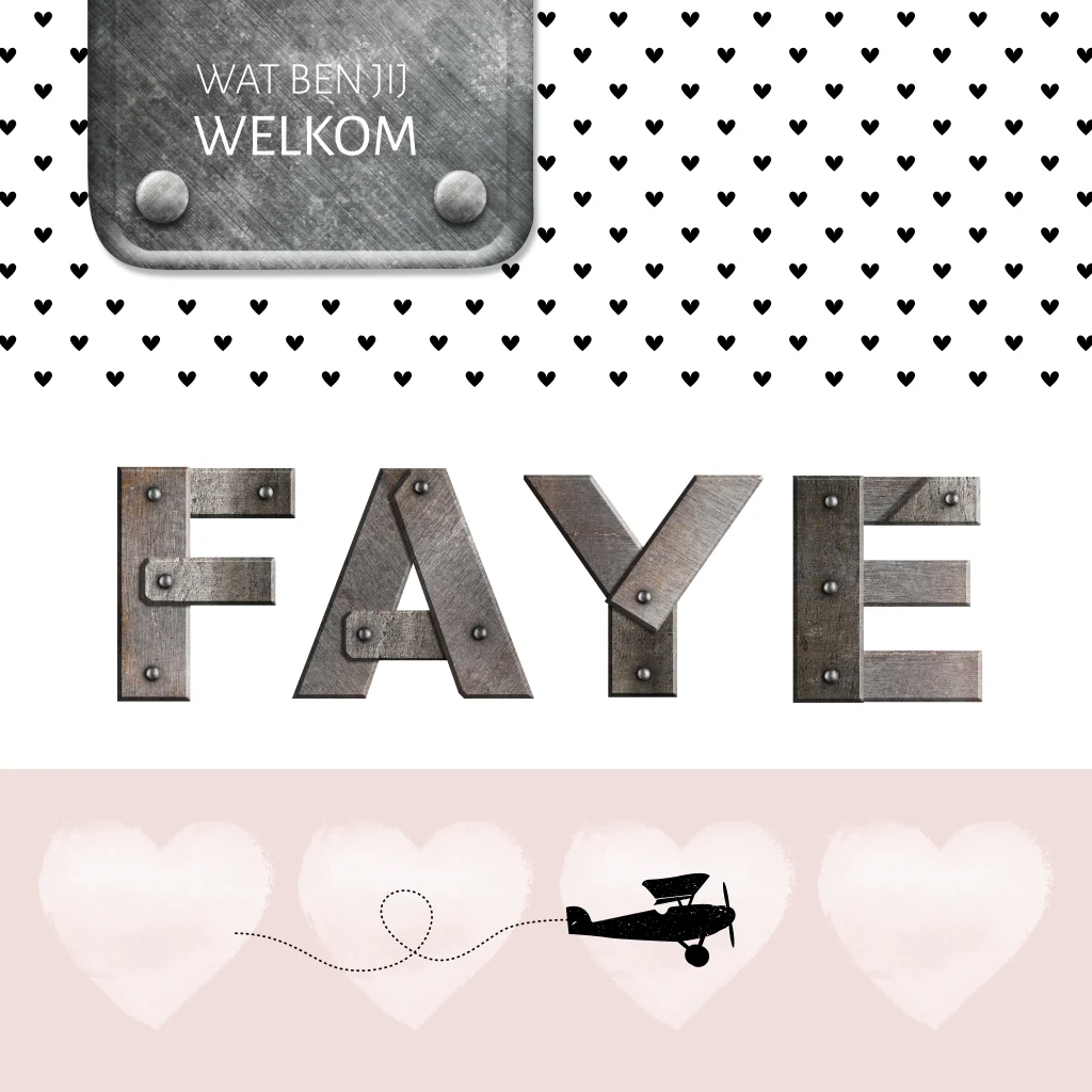 Stoer adoptiekaartje voor een meisje met metalen letters. De letters zijn aan te passen in de editor of we helpen je er graag bij. Verder staan er op dit kaartje Faye stoere labeltjes en hartjes.