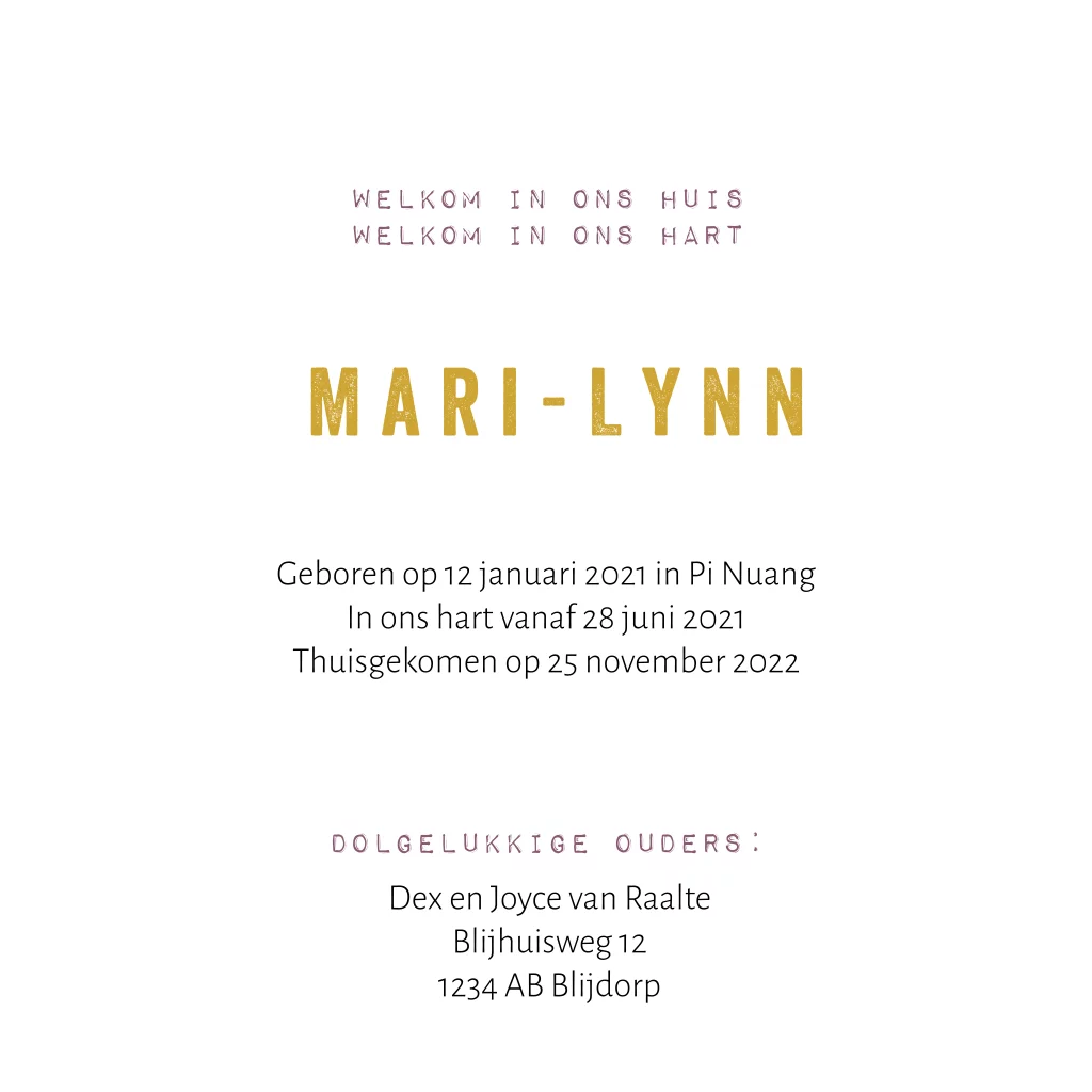 Hip adoptiekaartje voor een meisje. Dit kaartje Mari-Lynn met op de voorzijde een wereldkaart is modern met trendy kleuren en mooie teksten. De kleuren en teksten zijn gemakkelijk aan te passen.