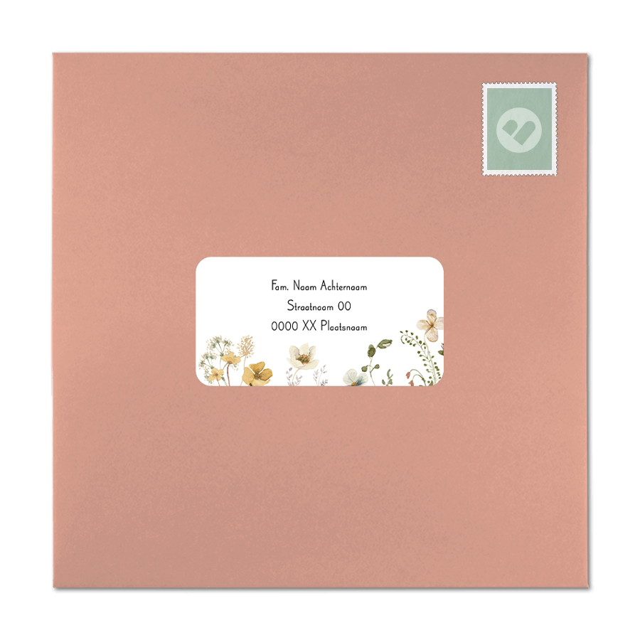 Adressticker voor op de envelop van het geboortekaartje, de trouwkaart of uitnodiging. Op de adressticker staan romantische bloemetjes in verschillende kleuren. Voeg heel eenvoudig de adressen op de stickers toe.