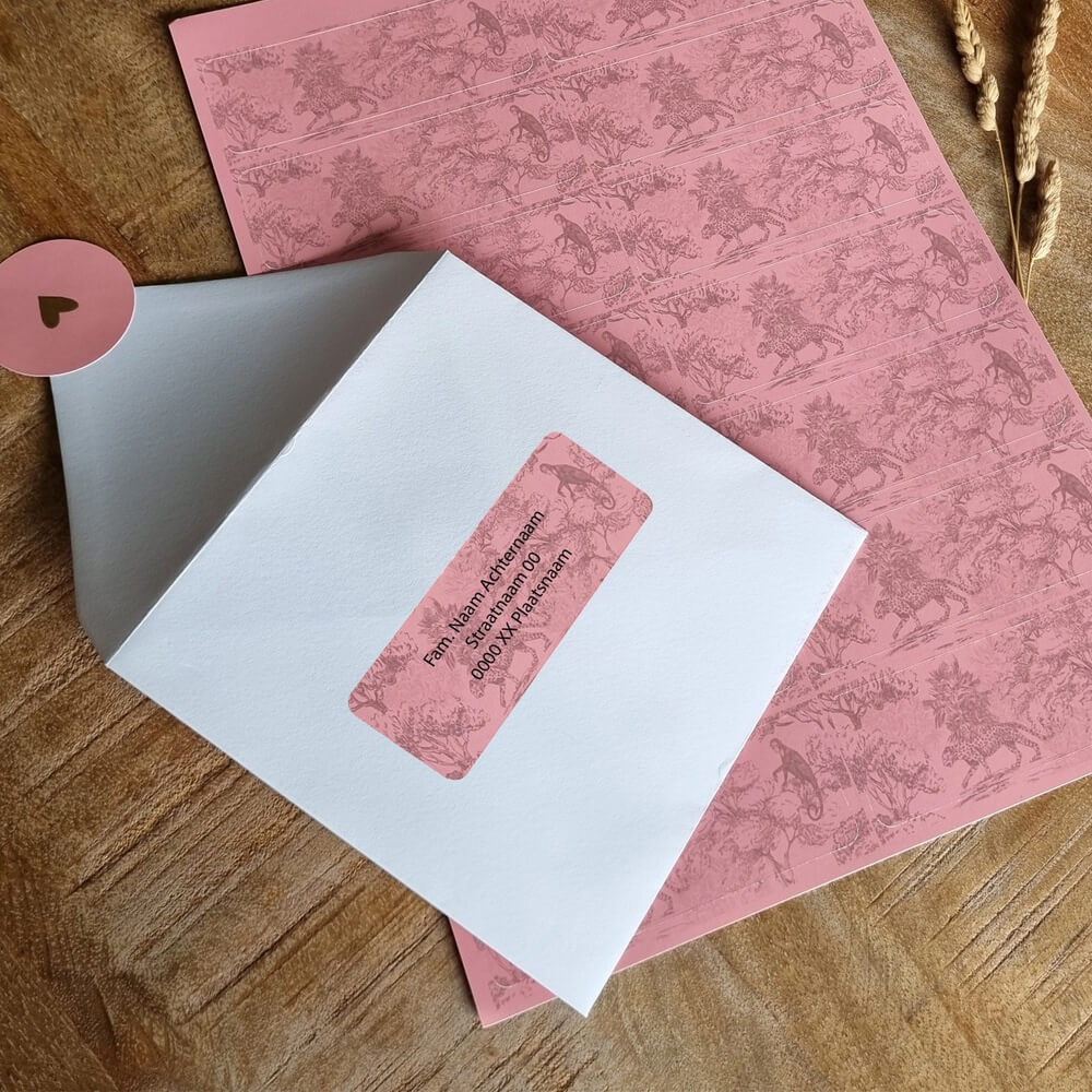 Adresstickers bijpassend bij de geboortekaartjes geïnspireerd op dat van Esther Vedder. De adresstickers hebben een roze achtergrond en bruine safari dieren, of terwijl 'Pink Jungle'.