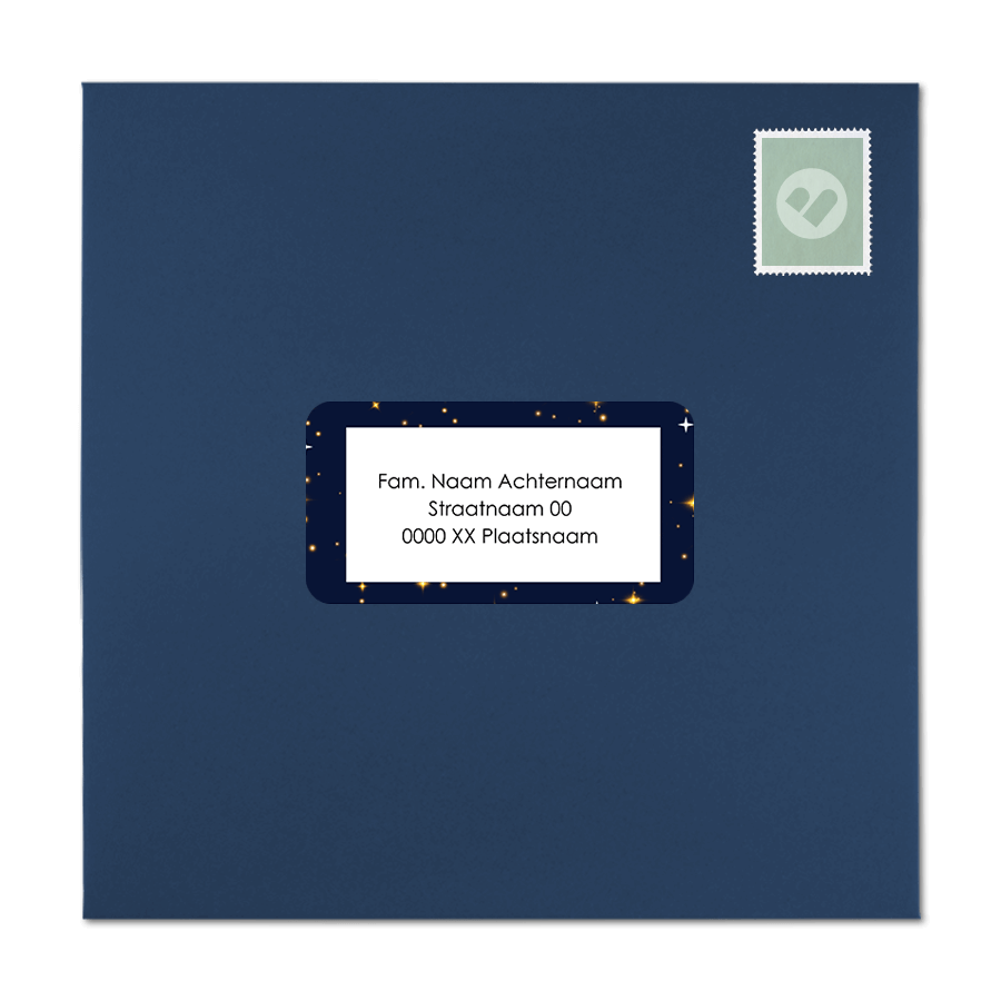 Een sprankelende adressticker voor de kerst of een andere sprankelende gelegenheid! Kies voor deze adressticker om je kaarten in stijl te versturen. Op deze adressticker zie je een kader met een donkerblauwe achtergrond en gouden sterretjes. Dit adresetiket heeft een rechthoekig formaat met afgeronde hoeken. Pas deze adressticker naar eigen wens aan in onze online editor.