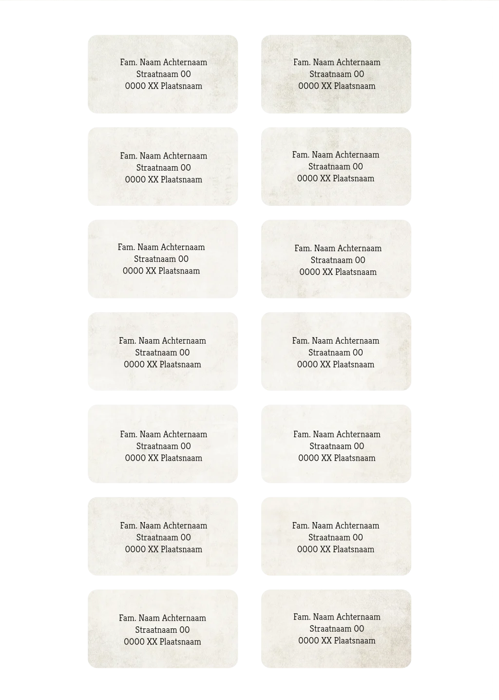 Maak de envelop van je Save the Date kaart of trouwkaart af met een adressticker in dezelfde stijl. Zet zelf heel eenvoudig alle adressen op de adresstickers. Deze adresstickers horen bij deze trouwkaart.Totaalprijs: 0 |