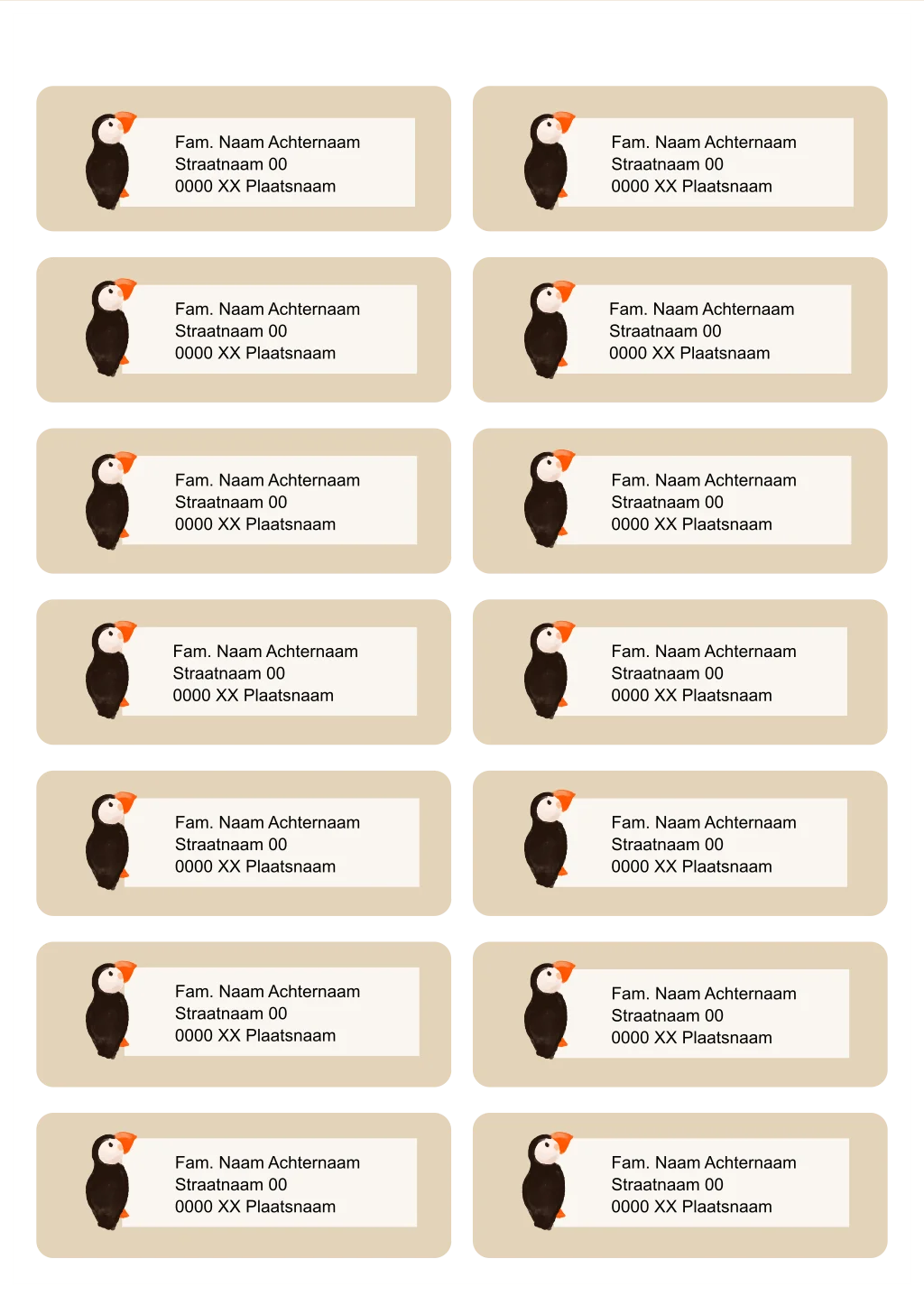 Adressticker met een leuke papegaaiduiker, erg leuk om te gebruiken op de envelop van een geboortekaartje of de uitnodiging voor het eerste feestje van je kleintje. Zet zelf heel eenvoudig in de editor alle adressen op de adresstickers.