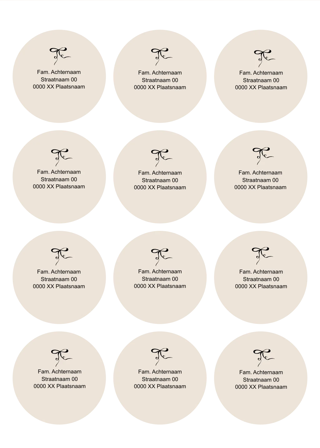 Ronde adressticker met een beige achtergrond en een zwart strikje. Zet zelf heel eenvoudig in de editor alle adressen op de adresstickers.