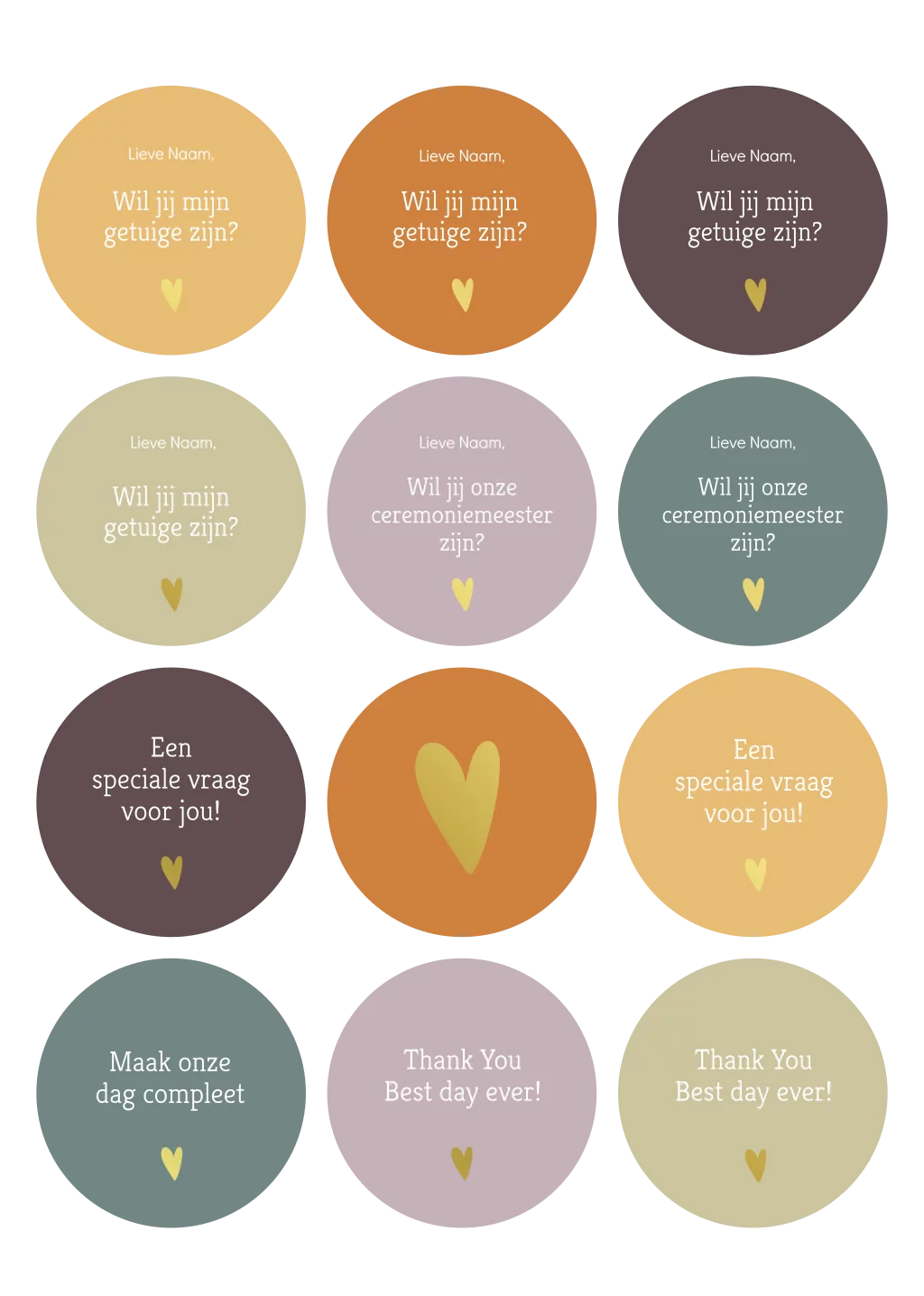Kleurrijk stickervel getuige vragen cadeau met hartje en goudfolie