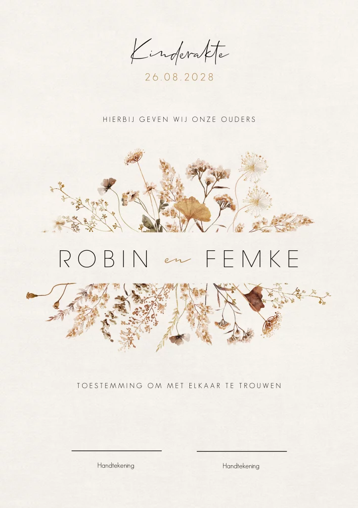 Stijlvolle kinderakte met prachtige aquarel bloemen en linnenlook achtergrond. Jullie namen staan in een kader, omringd met bloemen. Deze kinderakte is speciaal ontworpen om je kinderen te betrekken bij jullie huwelijksceremonie. Het is natuurlijk het allerleukst om de kinderakte in de stijl van de trouwkaart te (laten) ontwerpen.