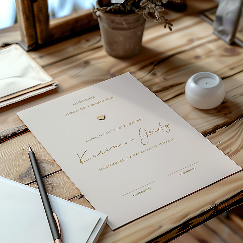 Een eenvoudige trendy kinderakte voor jullie bruiloft. Laat je kinderen de kinderakte ondertekenen en betrek ze zo bij dit bijzondere moment. Deze kinder trouwakte heeft een basic design maar het houten hartje maakt deze helemaal exclusief. De kinderakte past bij deze trouwkaart. Teksten en kleuren zijn makkelijk aan te passen in onze editor.
