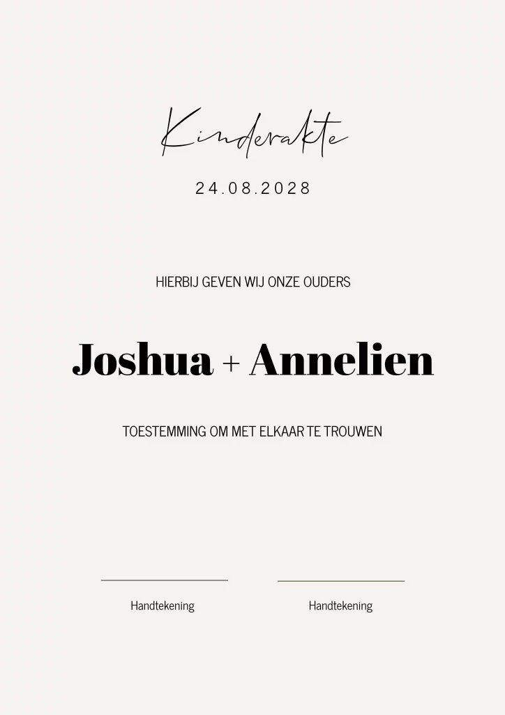 Typografische kinderakte met een strak basic design. Deze kinderakte is speciaal ontworpen om je kinderen of neefjes of nichtjes te betrekken bij jullie huwelijksceremonie. Deze kinderakte hoort bij de trouwkaarten set eigen foto. Bestel vandaag nog jullie eigen exemplaar en maak van jullie huwelijksceremonie een onvergetelijke gebeurtenis.