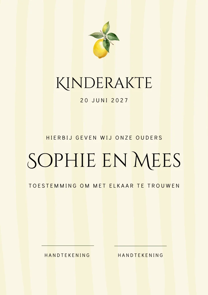 Een stijlvolle kinderakte met een gestreepte achtergrond in gele kleurtinten en een geïllustreerd citroentje. Deze kinderakte is speciaal ontworpen om je kinderen of neefjes of nichtjes te betrekken bij jullie huwelijksceremonie. Bestel vandaag nog jullie eigen exemplaar en maak van jullie huwelijksceremonie een onvergetelijke gebeurtenis.