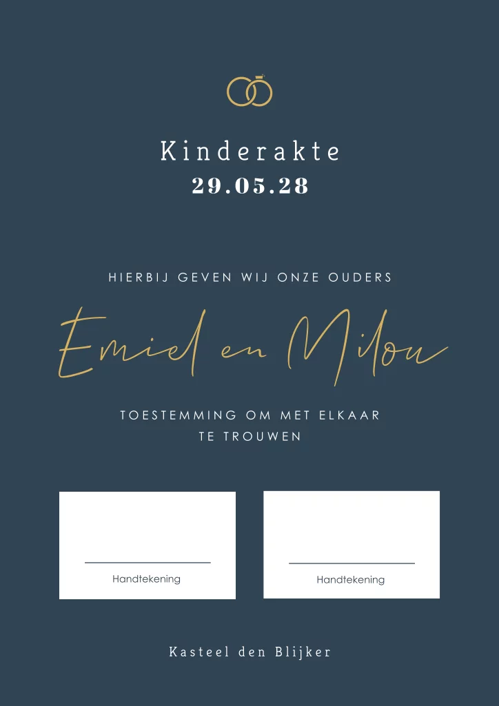 Geef je kinderen een speciale rol in jullie bruiloft door ze tijdens de ceremonie een kinderakte te laten ondertekenen. Zo worden ze op een originele manier betrokken bij dit bijzondere moment, hoe leuk! En het is natuurlijk het allerleukst om de kinderakte in de stijl van de trouwkaart te (laten) ontwerpen.
