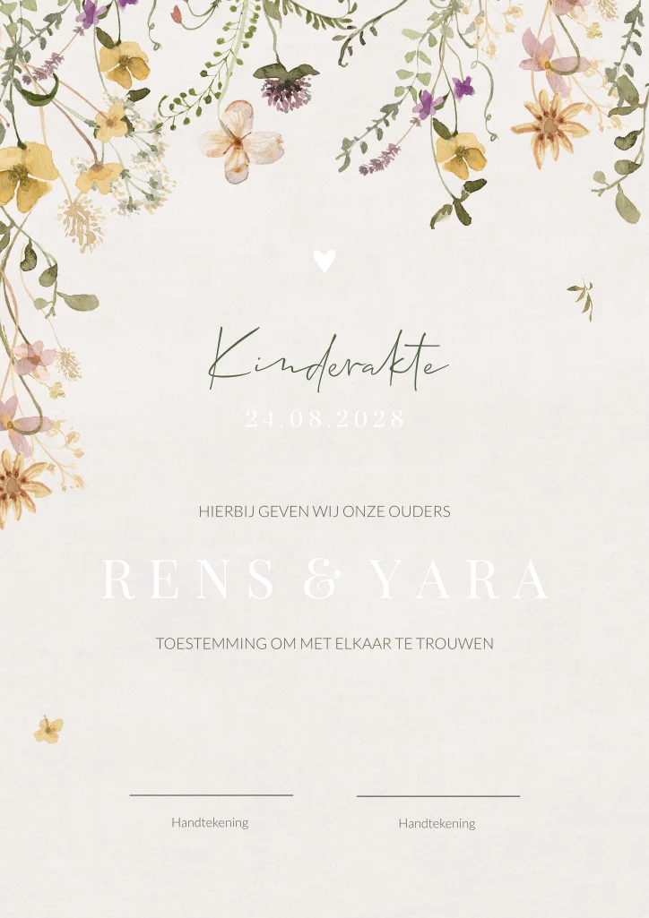 Stijlvolle kinderakte met prachtige aquarel bloemen, linnenlook achtergrond en foliedruk. De foliedruk geeft een luxe uitstraling. Deze kinderakte is speciaal ontworpen om je kinderen te betrekken bij jullie huwelijksceremonie. Het is natuurlijk het allerleukst om de kinderakte in de stijl van de trouwkaart te (laten) ontwerpen.| Totaalprijs: 0 |