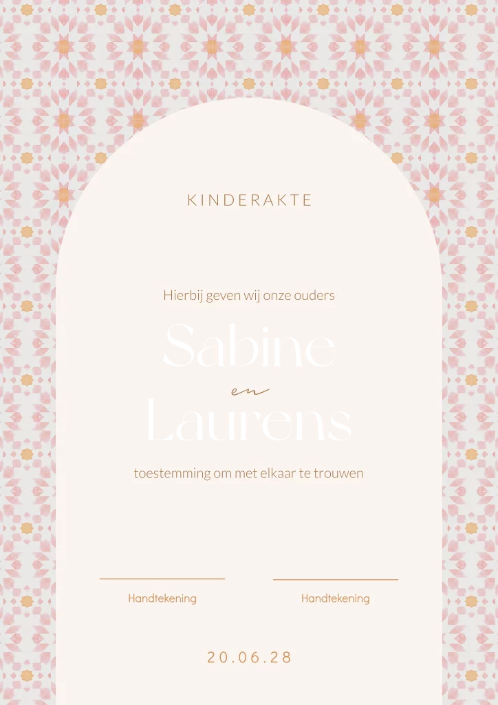 Een leuke kinderakte met een mediterraans tegeltje als patroon. In het midden van deze akte zie je een boogvorm kader met de namen van het bruidspaar en plek voor de handtekening van de kinderen. Deze kinderakte is speciaal ontworpen om je kinderen of neefjes of nichtjes te betrekken bij jullie huwelijksceremonie. De foliedruk geeft een luxe uitstraling. Bestel vandaag nog jullie eigen exemplaar en maak van jullie huwelijksceremonie een onvergetelijke gebeurtenis.| Totaalprijs: 0 |