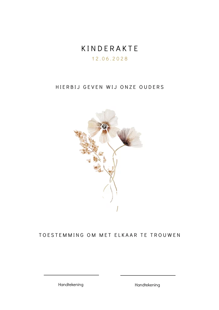 Stijlvolle kinderakte met prachtige aquarel bloemen en goudfolie. Deze kinderakte is speciaal ontworpen om je kinderen te betrekken bij de huwelijksceremonie. De folie heeft een mooie glans en geeft deze akte een extra luxe uitstraling. En het is natuurlijk het allerleukst om de kinderakte in de stijl van de trouwkaart te (laten) ontwerpen. Bekijk onze bloemen trouwkaarten hier.