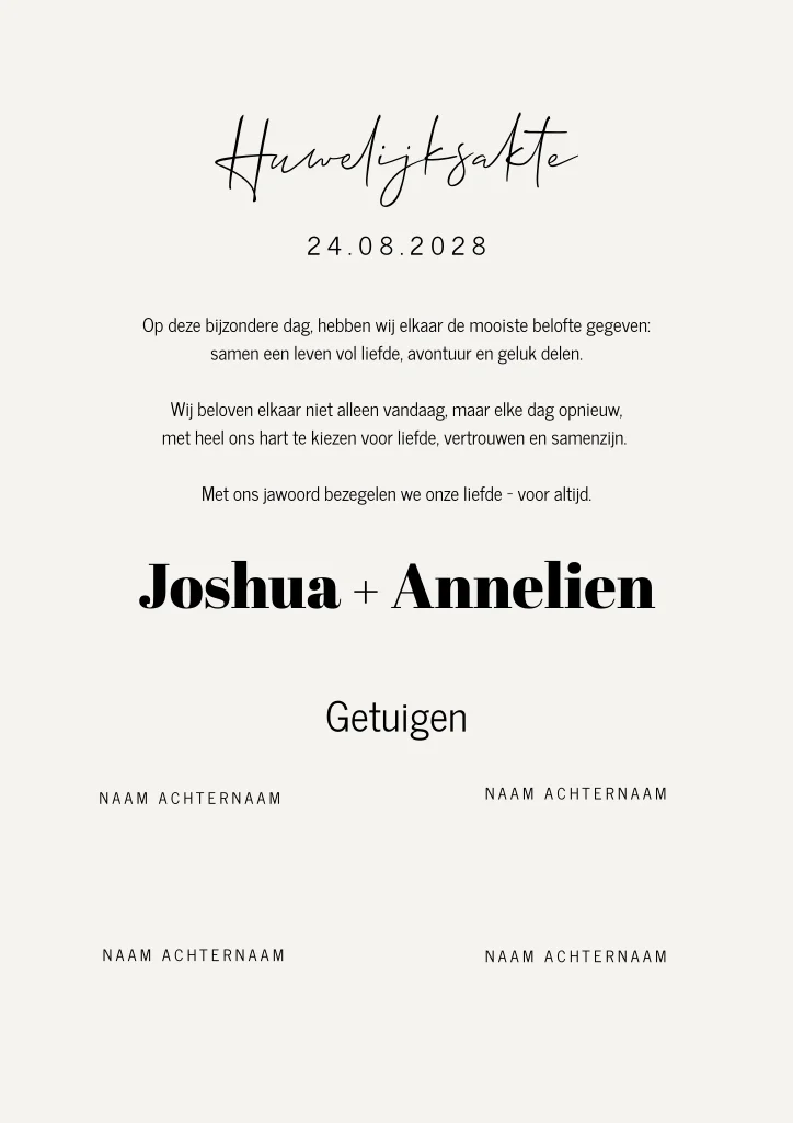Trouwakte voor bruiloft basic. Deze trouwakte hoort bij de trouwkaarten set eigen foto. Bestel vandaag nog jullie eigen exemplaar en maak van jullie huwelijksceremonie een onvergetelijke gebeurtenis.