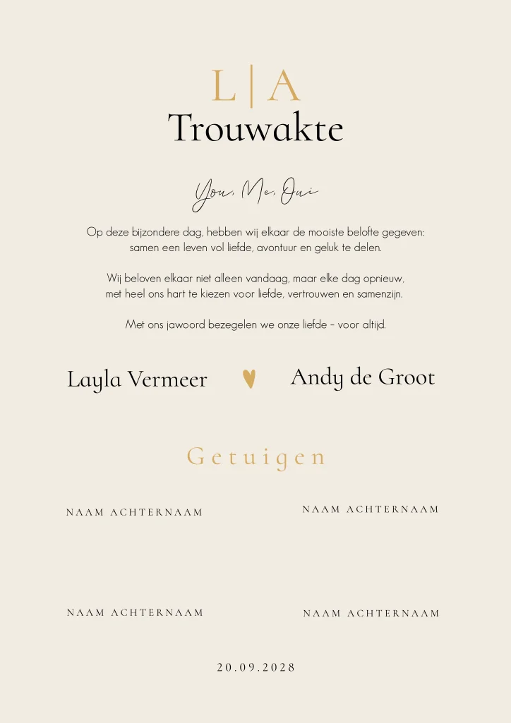 Trouwakte voor een bruiloft met initialen. Deze trouwakte hoort bij de trouwkaarten set geometrisch. Bestel vandaag nog jullie eigen exemplaar.| Totaalprijs: 0 |