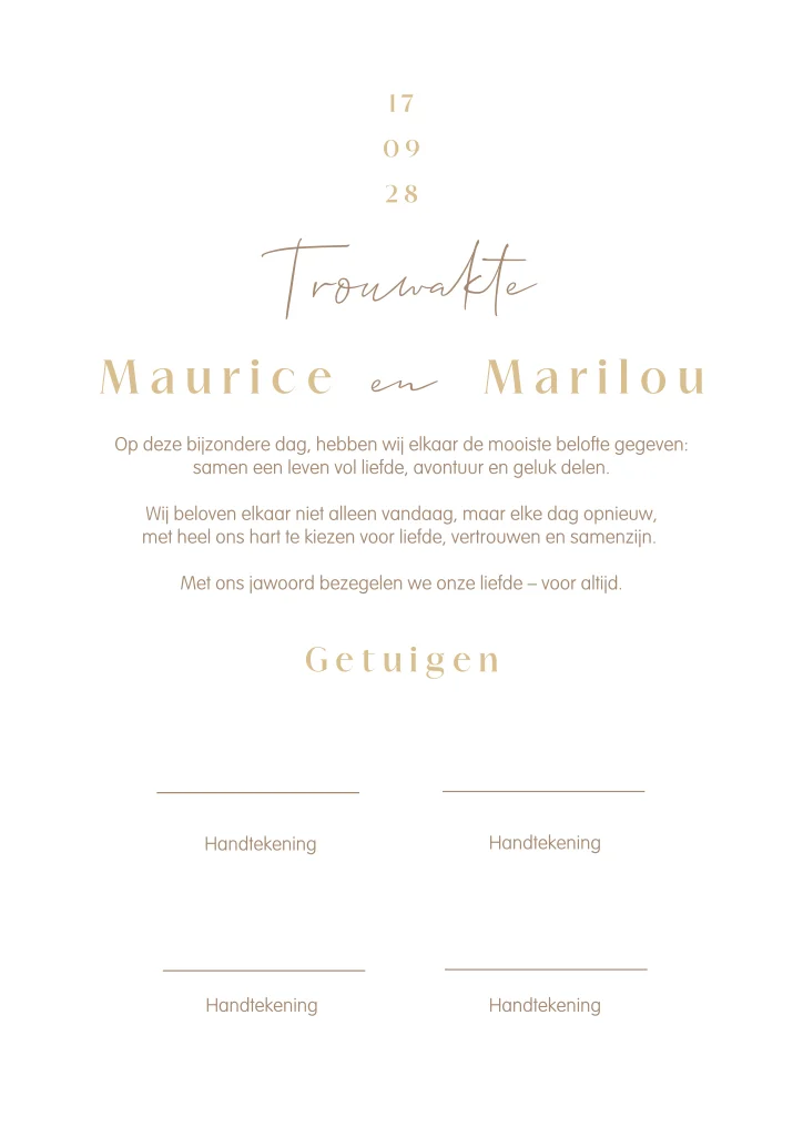 Trouwakte met een clean, basic design. Deze trouwakte hoort bij de trouwkaarten set clean hoogglans. Bestel vandaag nog jullie eigen exemplaar en maak van jullie huwelijksceremonie een onvergetelijke gebeurtenis.