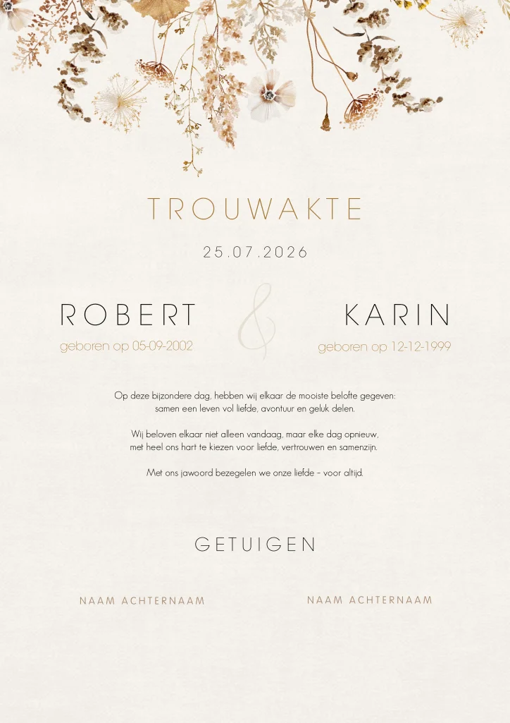 Trouwakte voor een bruiloft met initialen. Deze trouwakte hoort bij de trouwkaarten set bloemenkrans. Bestel vandaag nog jullie eigen exemplaar.| Totaalprijs: 0 |