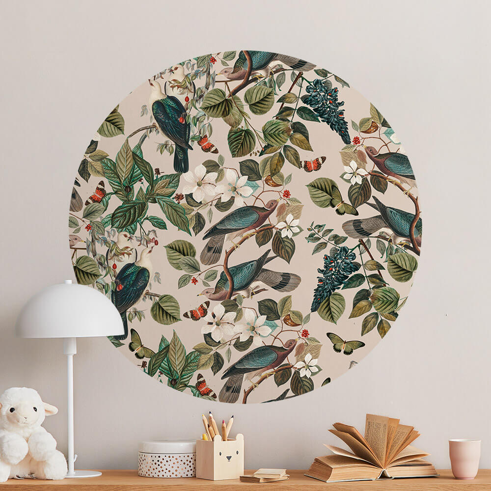 Behangcirkel botanisch met vogels, vlinders en bloemen