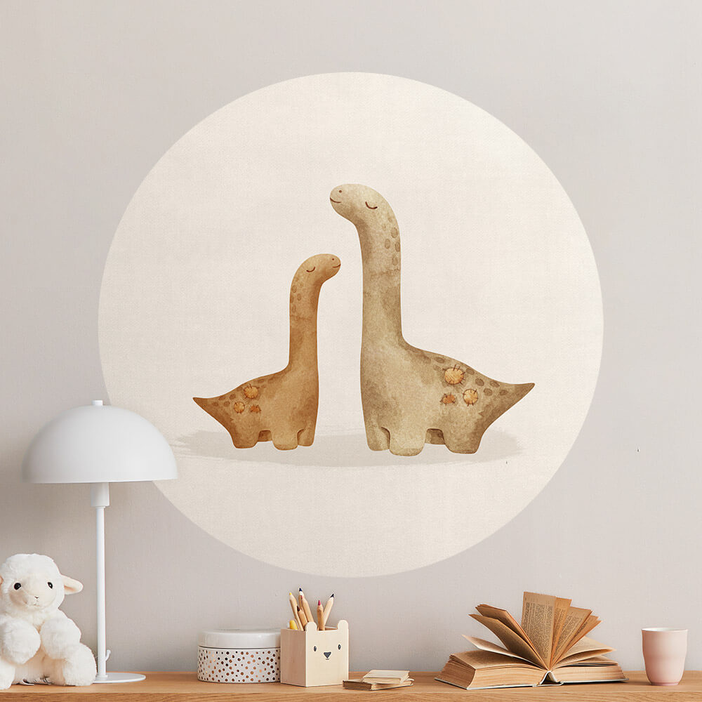 Rustige dinosaurus behangcirkel voor een jongen, jullie zoon! Op deze behangcirkel staan twee dinosaurussen in aquarel. De beige achtergrond heeft een lichte linnenlook.