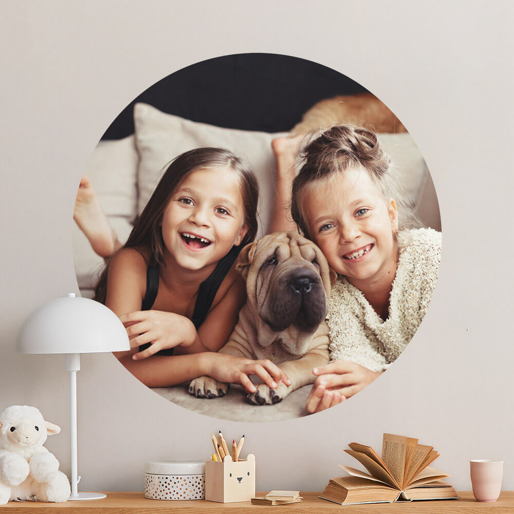 Ben je op zoek naar een uniek en origineel fotocadeau? Ontwerp dan je eigen behangcirkel met foto. Zet bijvoorbeeld een leuke foto van jullie gezin of kinderen op de behangcirkel. Op deze behangcirkel zie je een foto van twee kinderen met hun huisdier, een hond.