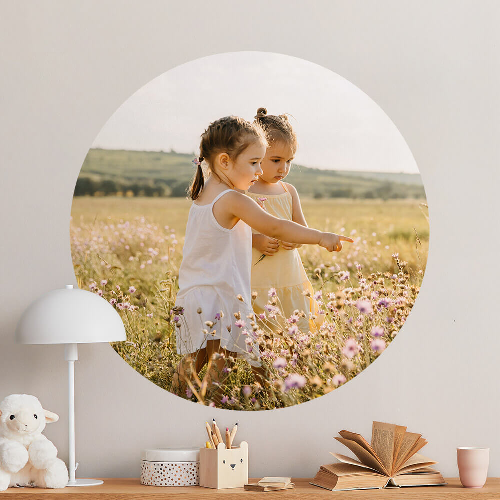 Hoe bijzonder, een behangcirkel met een eigen foto. Plak deze behangcirkel eenvoudig in je interieur. Op deze behangfoto zie je twee meisje in een bloemenweide. De foto vervang je gemakkelijk voor een eigen foto in de editor.