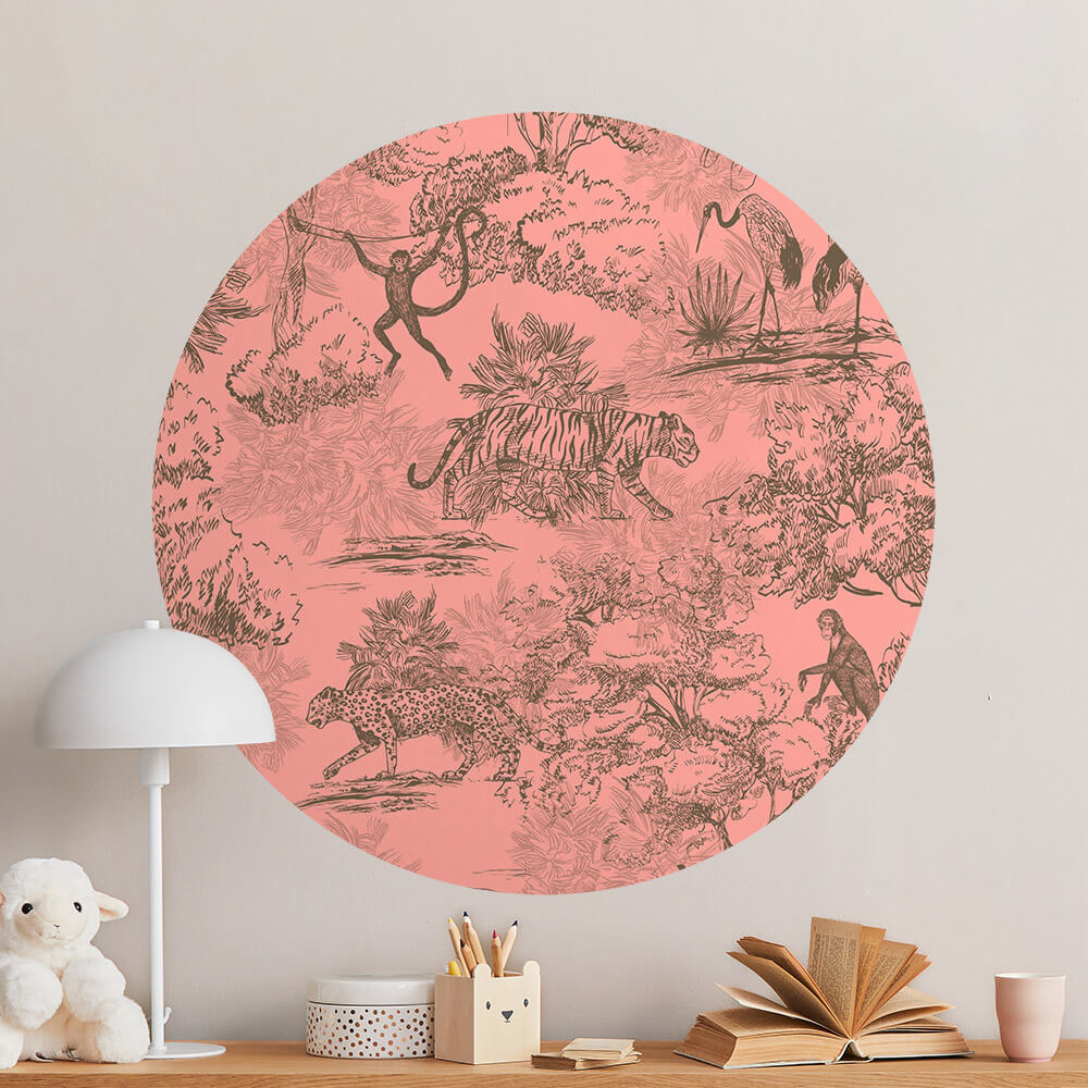 Behangcirkel geïnspireerd op het geboortekaartje van Esther Vedder. De achtergrond is roze en de jungle en safari dieren hebben een bruine kleur. Een echte eyecatcher in het interieur!