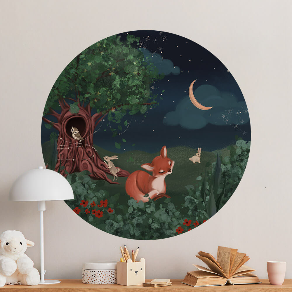 Een sprookje om naar te kijken, deze behangcirkel met bosdieren! Op deze behangcirkel zie je een aquarel bos landschap met een vos, konijntjes en een grote versierde boom met lichtslinger. In de uitholling van de boom zit een uil. Op de achtergrond de maan met sterren.