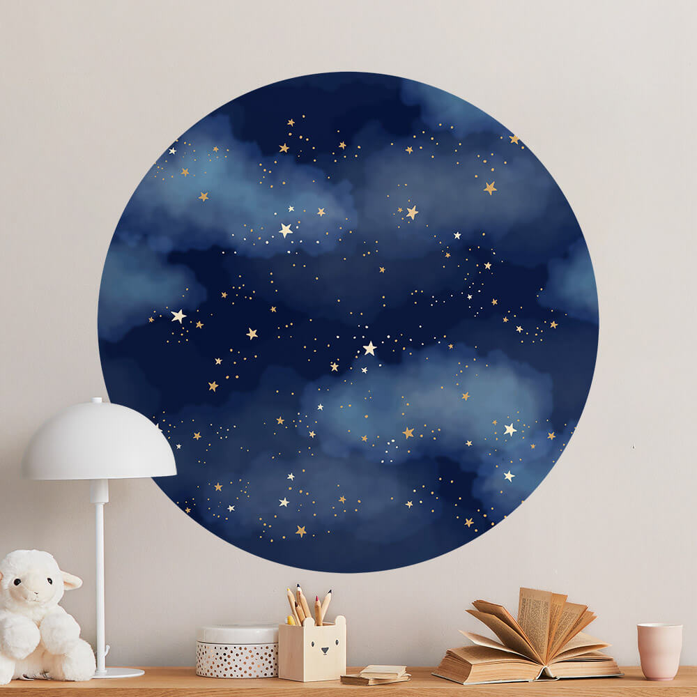 Prachtige behangcirkel voor de kinderkamer. De behangcirkel heeft een mooie, donkerblauwe kleur. Op de behangcirkel staan wolkjes en een sterrenhemel.
