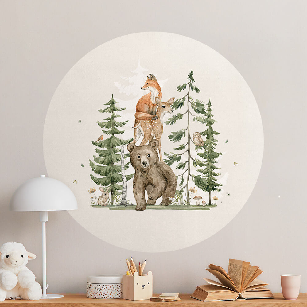 Een superschattige behangcirkel voor een jongenskamer met een dieren uit het bos. De diertjes staan op een grappige manier op elkaar.
