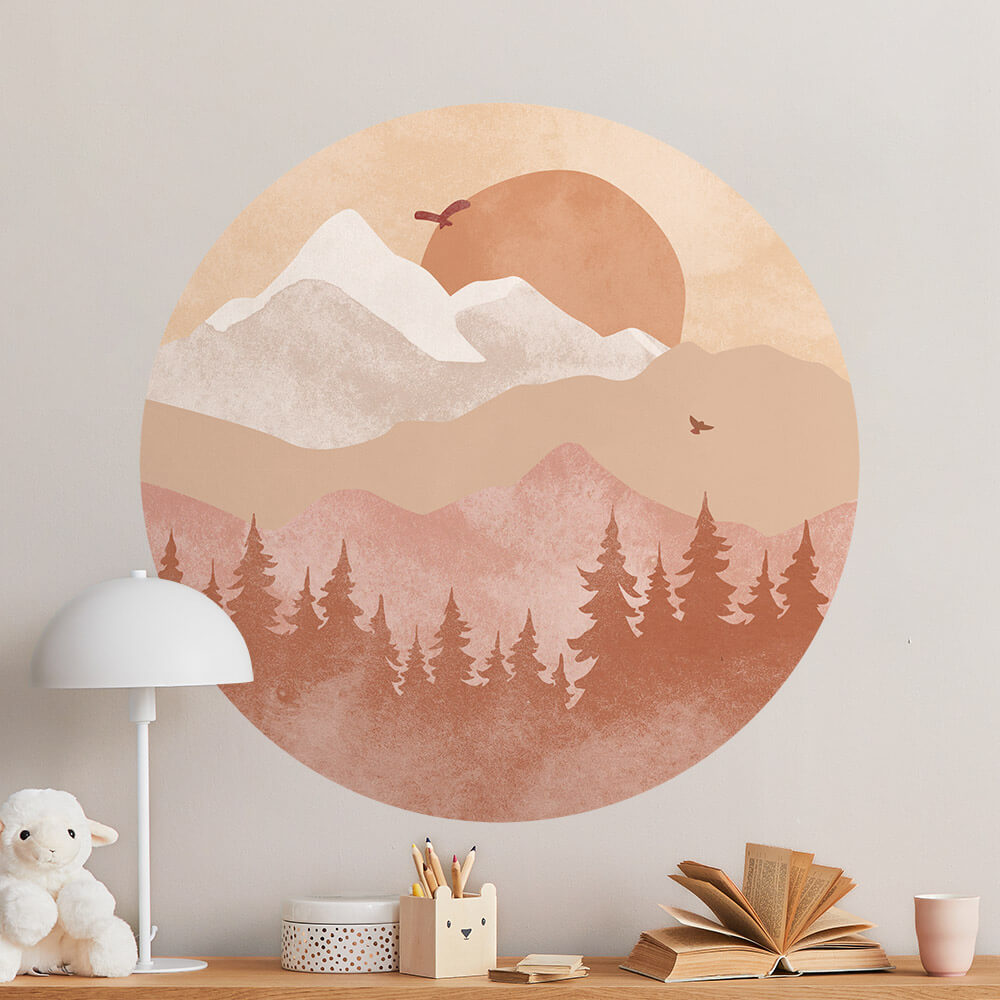 Een prachtige behangcirkel voor een meisjeskamer met bergen in terra roze aquarel, winterse bomen en een ondergaande zon in een warm roze tint. In de lucht vliegen vogels.