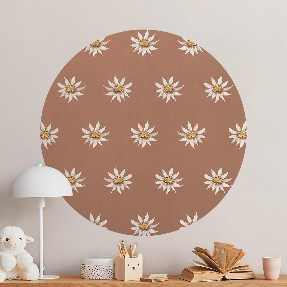 Een mooie behangcirkel voor een meisjeskamer met lieve madeliefjes. De behangcirkel heeft een trendy roze-bruine kleur.