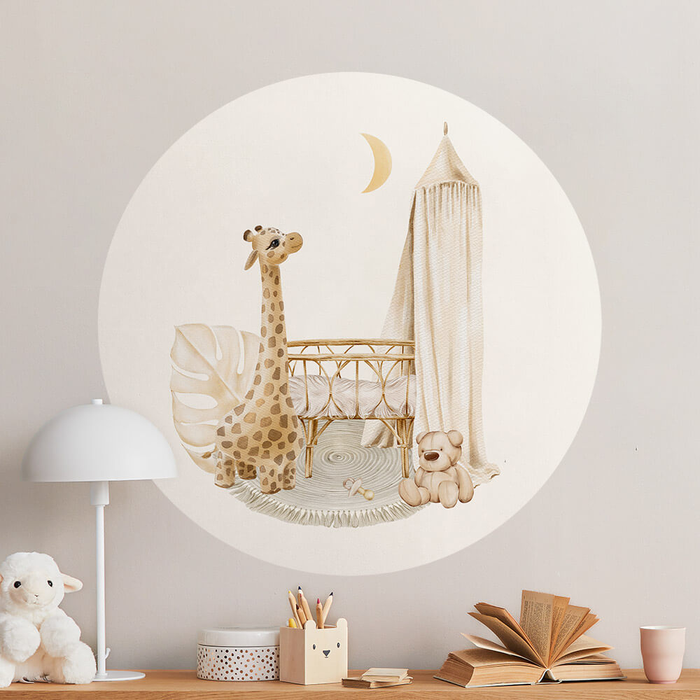 Prachtige boho behangcirkel voor zowel een jongen als meisje. Op deze behangcirkel een beige linnenlook achtergrond met een lief tafereeltje van rotan wiegje en twee knuffels, een giraffe en teddybeertje.