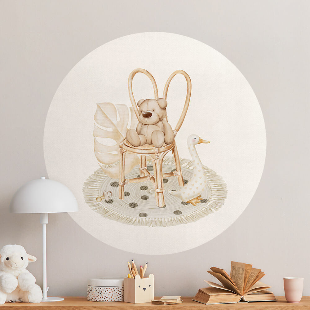 Prachtige behangcirkel voor de babykamer van jullie kleine jongen of meisje. Op deze behangcirkel een beige linnenlook achtergrond met een teddybeertje op een stoel, een kleedje en gansje.