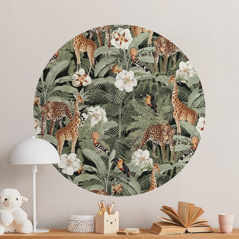Behangcirkel voor een jongen- of meisjeskamer in safari thema. Op deze jungle behangcirkel giraffes, tropische bloemen, luipaarden en vogels.