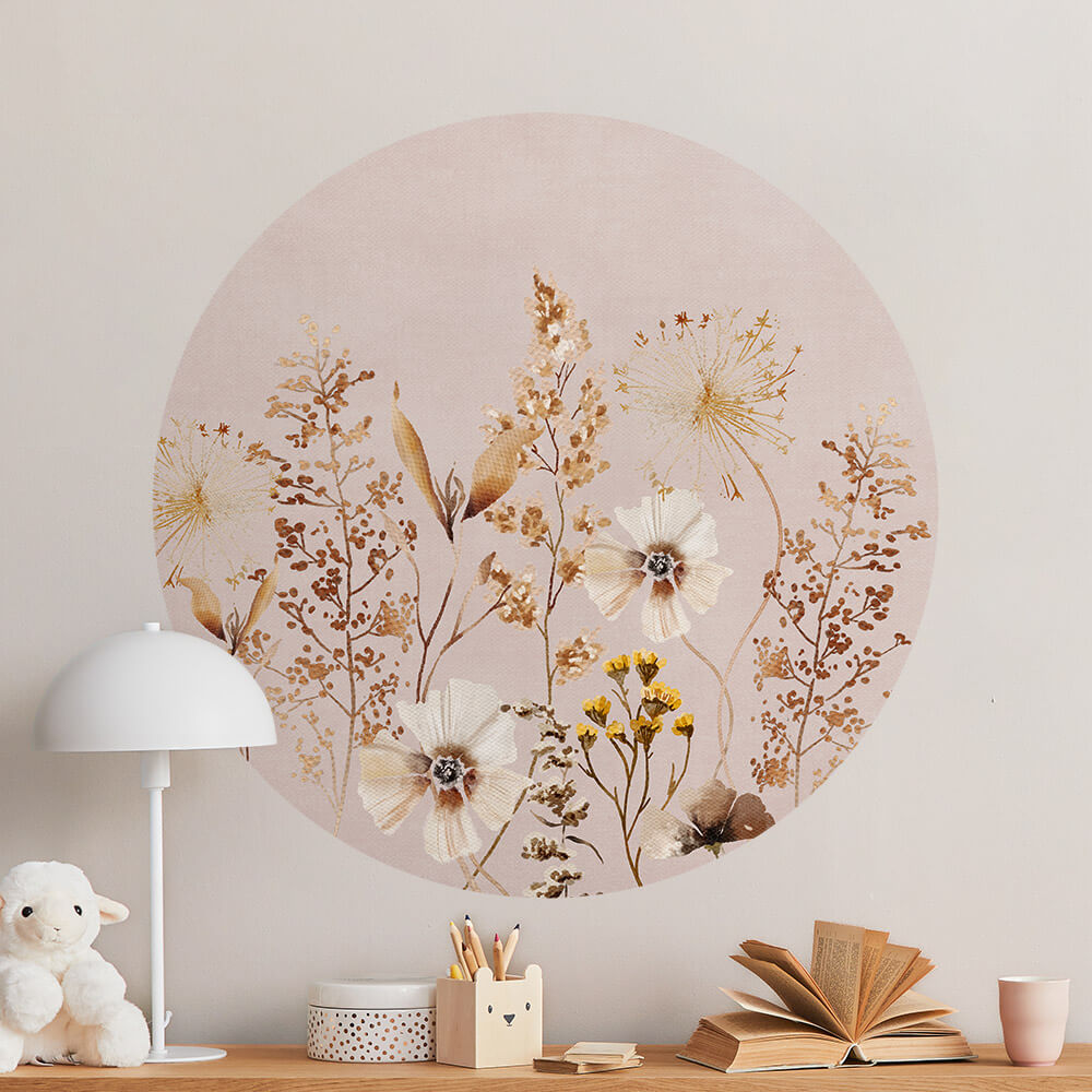 Behangcirkel voor een meisjeskamer. Op de behangcirkel staan prachtige veldbloemen op een roze linnenlook achtergrond.