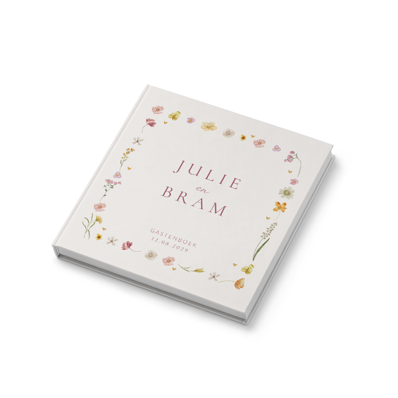 Gastenboek voor jullie bruiloft. Dit romantische gastenboek heeft een beige achtergrond met een bloemen kader met in het midden ruimte voor de namen van het bruidspaar.| Totaalprijs: 0 |