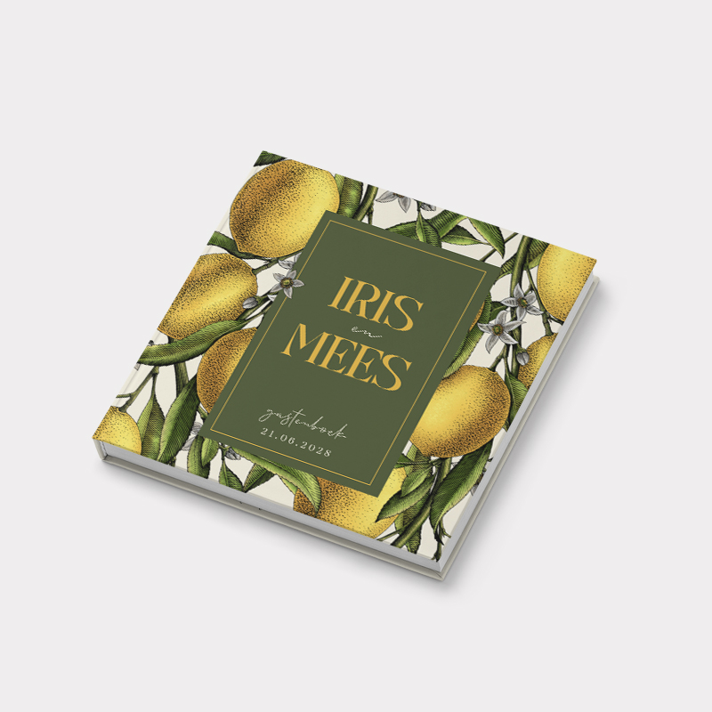 Een mooi gastenboek voor jullie bruiloft! Op de kaft van dit gastenboek zie je frisse citroentjes en een kader voor de namen van het bruidspaar en de trouwdatum.