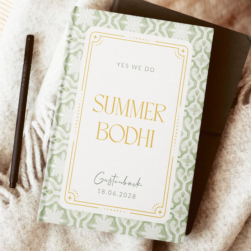 Prachtig gastenboek voor jullie bruiloft. De kaft heeft een mooi mediterraans patroon en op de voorzijde staat een boho kader met in het midden ruimte voor jullie namen.| Totaalprijs: 0 |