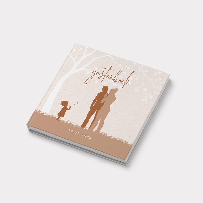 Een prachtig gastenboek met een silhouet van een papa, een mama en een kindje voor jullie bruiloft. Het gastenboek heeft een karton look en is vormgegeven in beige- en bruintinten.