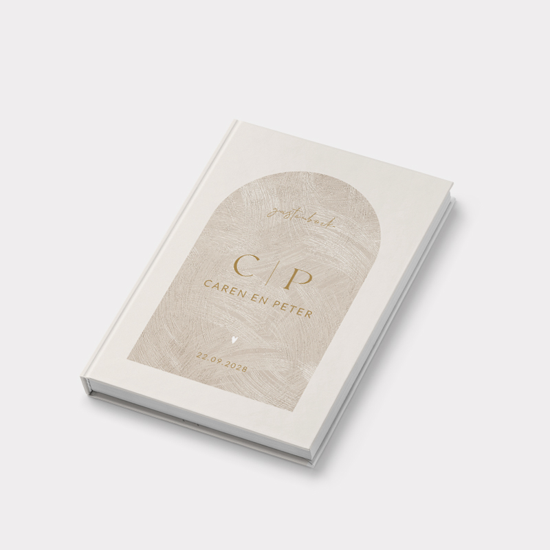 Stijlvol gastenboek voor jullie bruiloft. De kaft is rustig en heeft een zachte beige tint. In een boogvorm van gouden structuur met vegen zet je jullie initialen en trouwdatum.