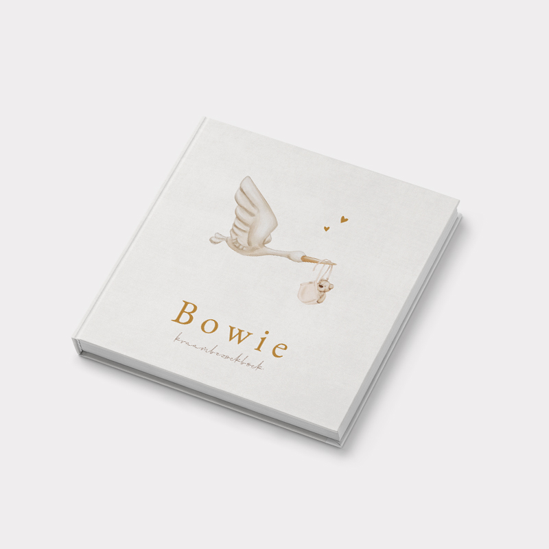 Kraambezoekboek voor jullie pasgeboren zoon of dochter. De kaft van dit boek Bowie is offwhite en heeft op de voorzijde een ooievaar maar in zijn snavel een mandje met een teddybeertje, super schattig!