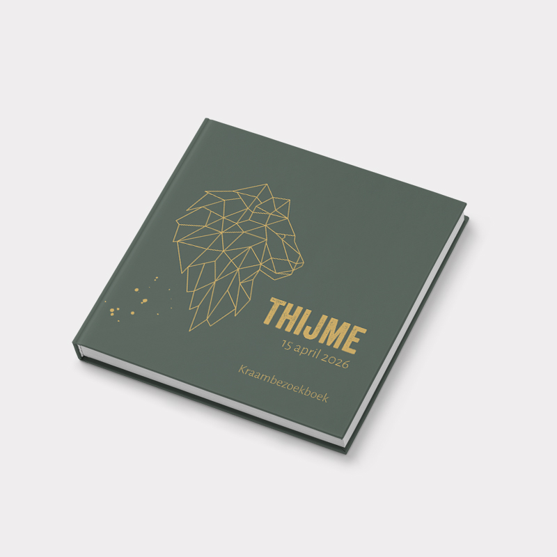 Kraambezoekboek Thijme voor jullie pasgeboren baby. De kaft heeft een groene kleur, op de voorzijde staat een geometrische leeuw. Er is ruimte voor de naam van de baby en de geboortedatum.