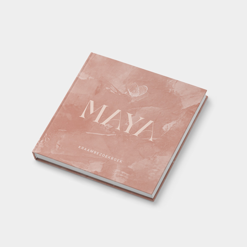 Kraambezoekboek geïnspireerd op het fingerprint geboortekaartje Maas van Anne Vedder, maar dan in meisjesvariant. Op dit kraambezoekboek een stoere roze betonlook achtergrond met twee vingerafdrukken in de vorm van een hartje. Dit kraambezoekboek Maya is geschikt voor een meisje.