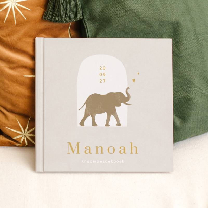 Kraambezoekboek linnenlook met olifant. De kaft van dit boek Manoah is beige en is geschikt voor zowel een jongen als een meisje.