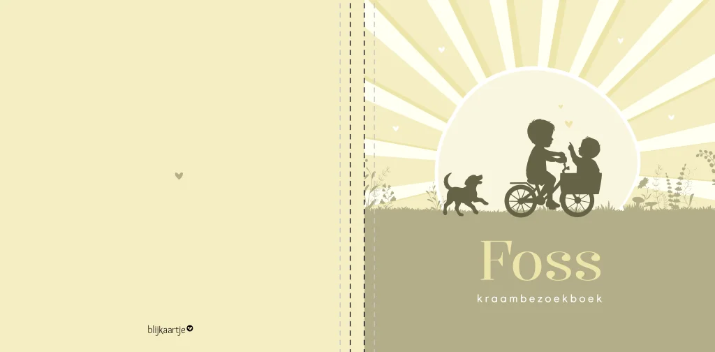 Vrolijk kraambezoekboek voor jullie pasgeboren zoon. Op dit kraambezoekboek Foss zie je een gele zon met zonnestralen en een silhouet van een grote broer met zijn kleine broertje op de fiets. Achter ze rent een hondje. Het boek heeft een vrolijke botergele kleur met pistache groen. Helemaal volgens de laatste kleurtrend!