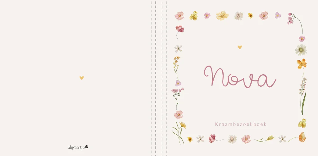 Kraambezoekboek voor een meisje. Dit kraambezoekboek Nova heeft een mooi bloemenkader met hartjes. Het is een vrolijk design met kleurrijke bloemen.| Totaalprijs: 0 |