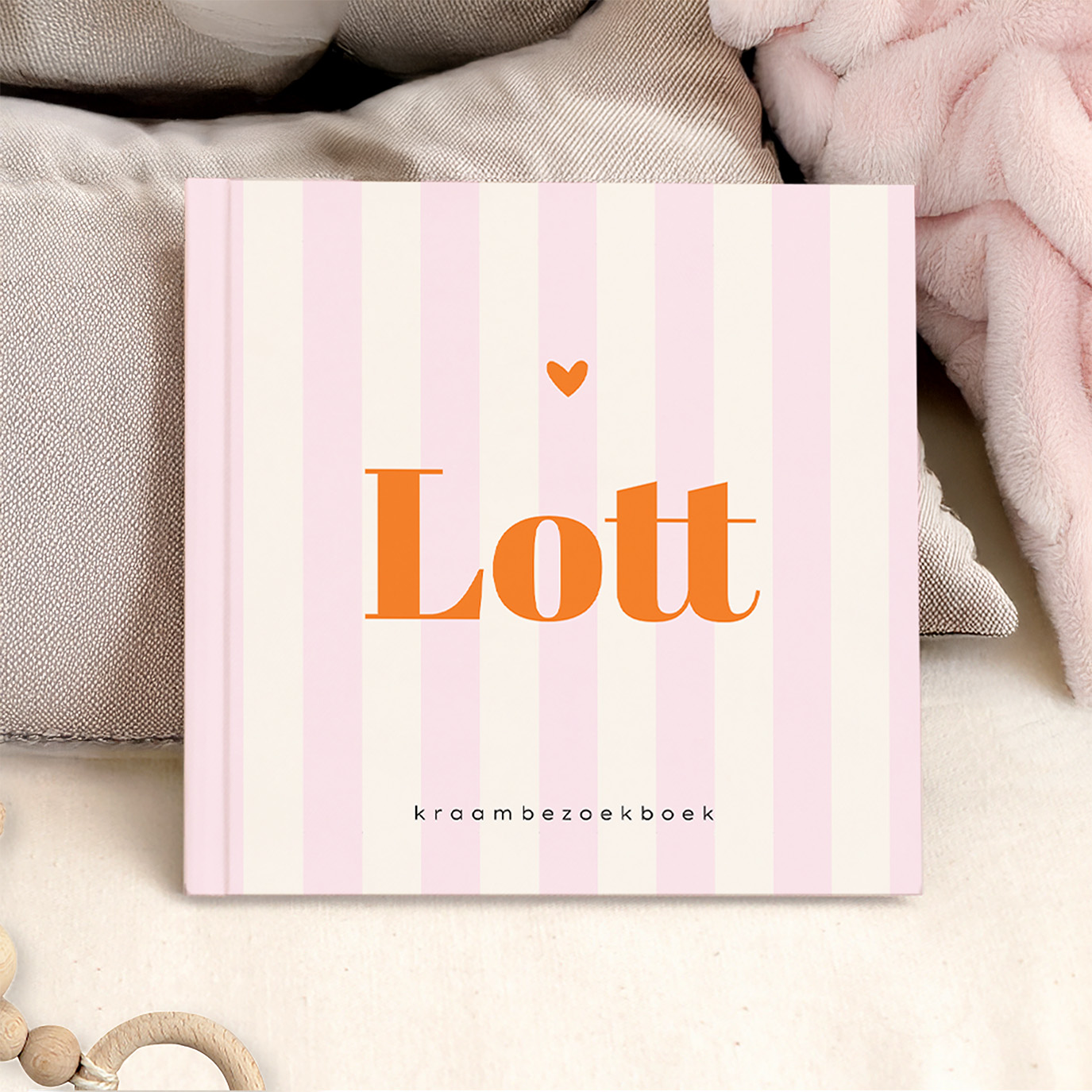 Hip kraambezoekboek voor jullie pasgeboren dochter. De kaft van dit boek Lott heeft een vrolijk en kleurrijk patroon van roze strepen.